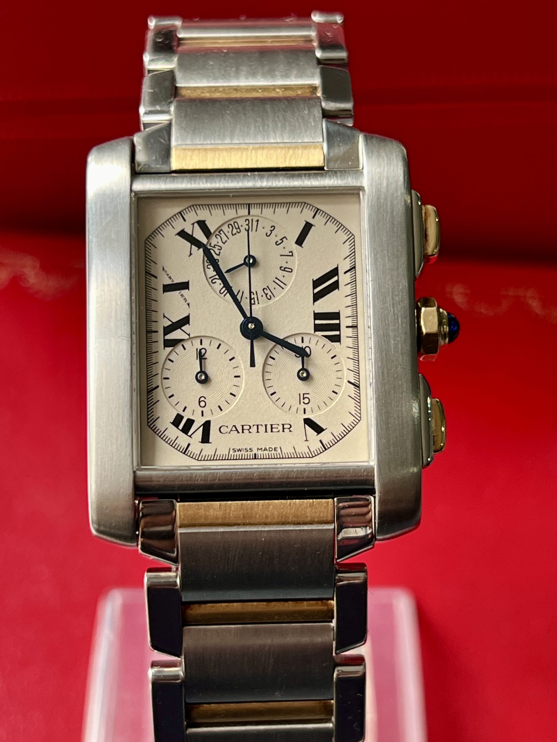 Up for your consideration is this gents Cartier tank Française chronoflex in stainless steel and 18k gold.